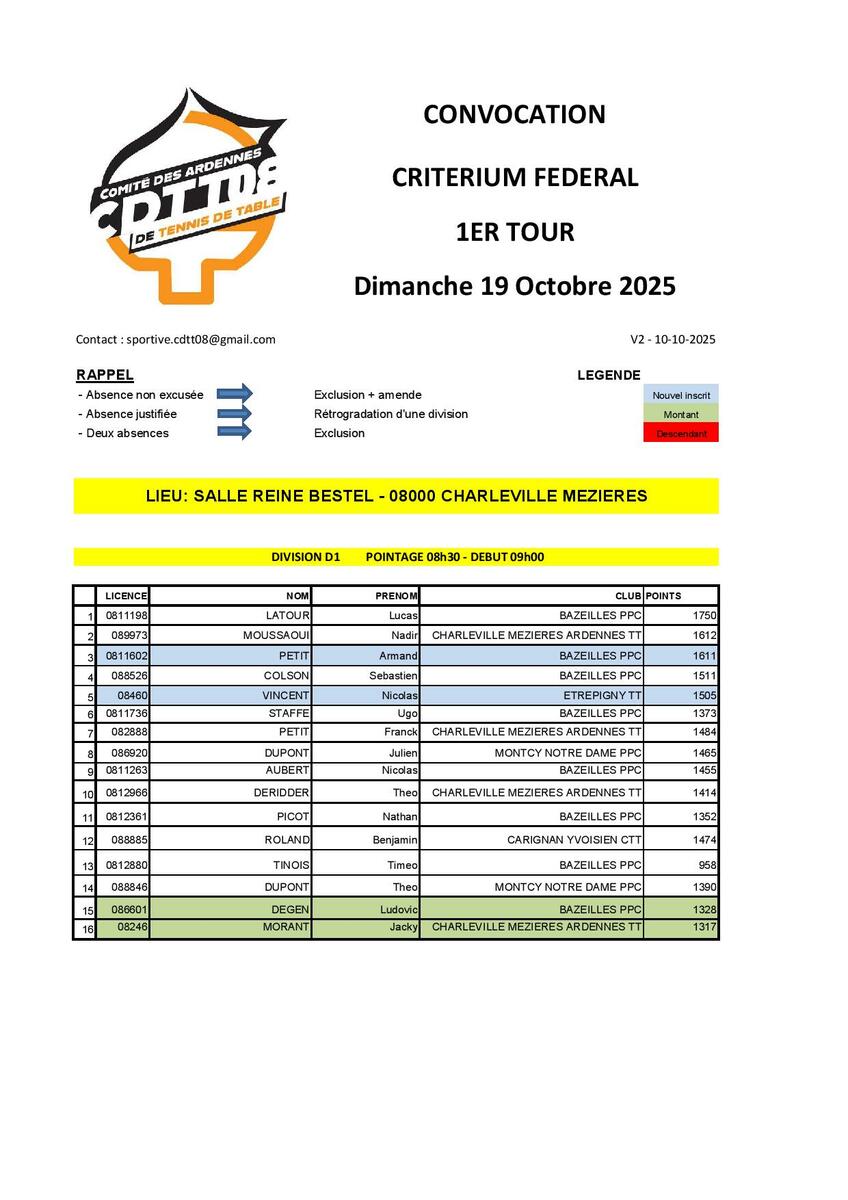 Voici la convocation mise à jour pour le 1er tour du critérium prévu dimanche 19/10/2025 à Charleville-Mézières.