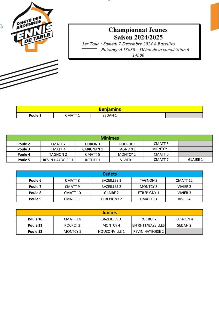 Vous trouverez en pièce jointe la Version 2 de la convocation au championnat jeunes - 1e tour, qui aura lieu samedi 7 décembre à Bazeilles