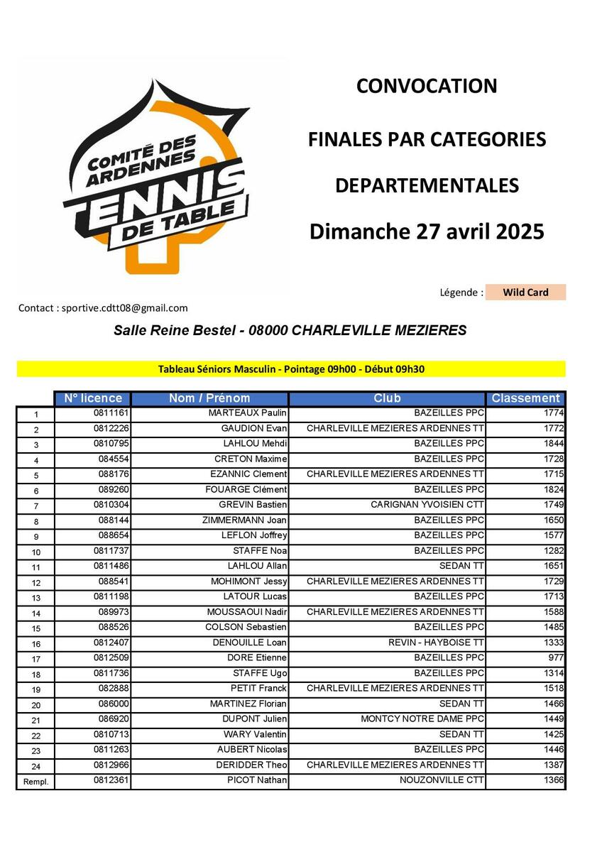 Dans certaines catégories, des Wild Card ont été attribués afin de compléter les tableaux et de mettre en valeur le ping ardennais.