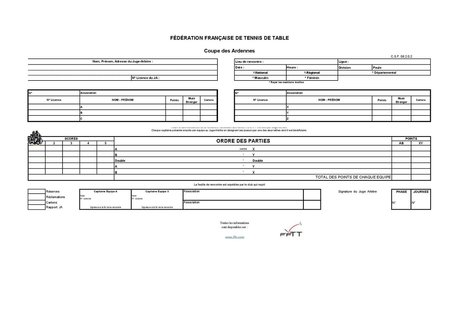 - Pour les équipes constitués de joueurs de plusieurs clubs (entente), vous ne pourrez pas saisir les résultats. Vous devez transmettre une copie claire et lisible de la feuille de match, par mail à sportive.cdtt08@gmail.com pour que nous puissions effectuer la saisie des résultats