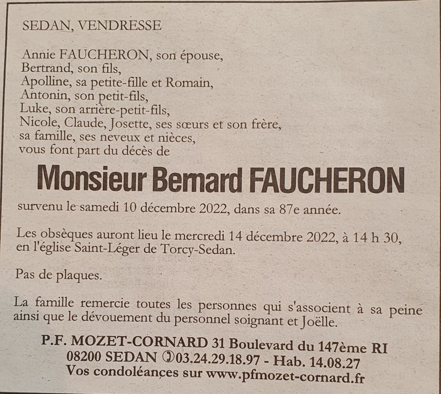 C'est avec tristesse que je vous fais part du décès de Bernard FAUCHERON, grand dirigeant du tennis de table ardennais.