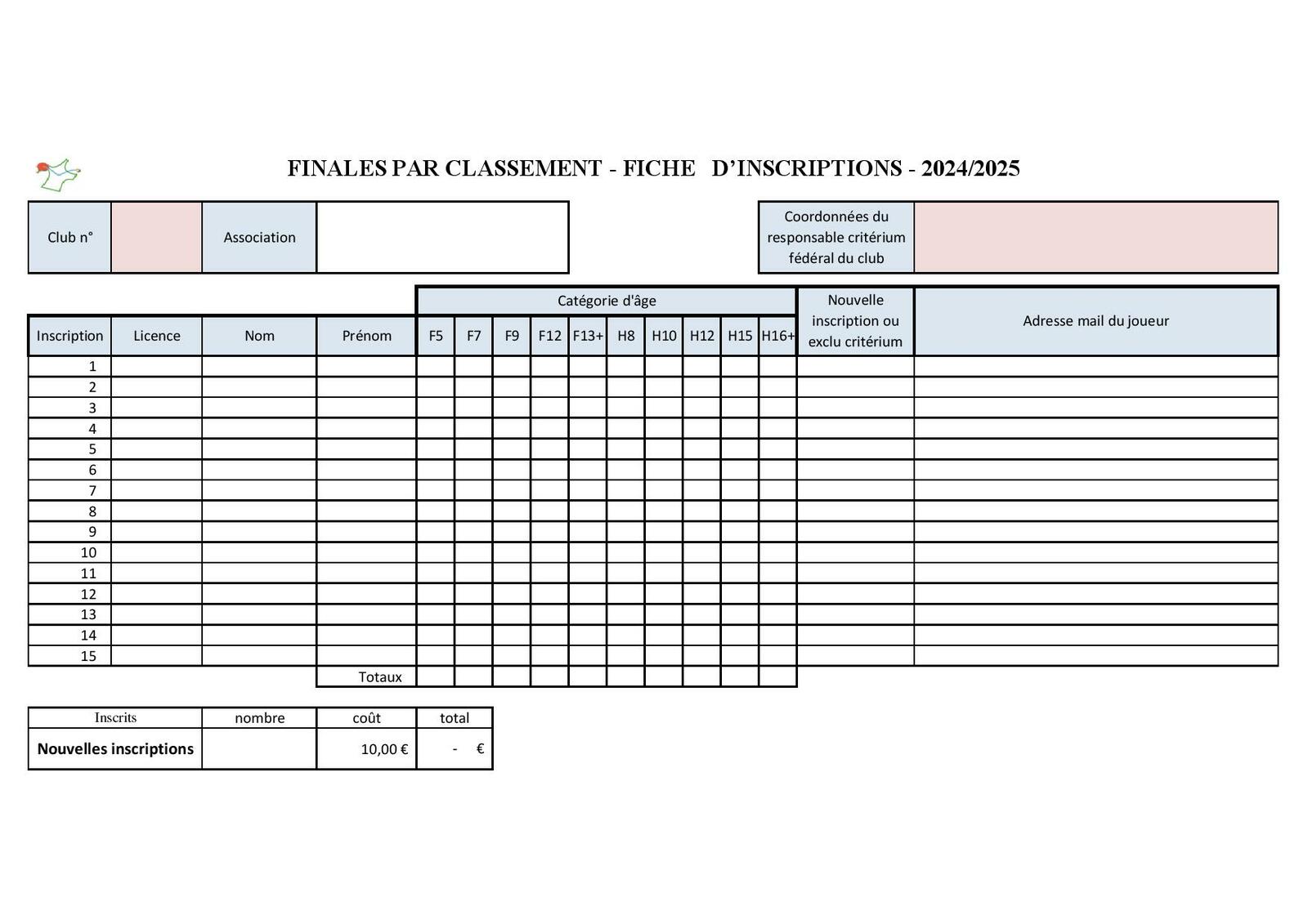 Vous trouverez, ci-joint, le formulaire d'inscription pour les finales départementales par classement qui auront lieu : Le dimanche 23 février 2025 à Tagnon.