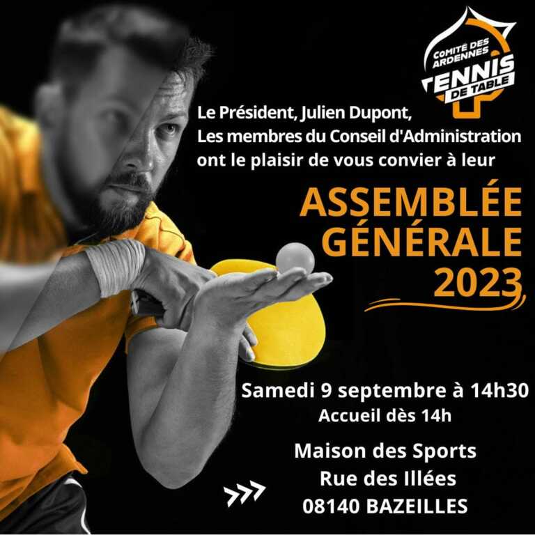 Vous trouverez ci-joint l'invitation à l'Assemblée Générale du Comité des Ardennes de Tennis de Table du samedi 9 septembre 2023.