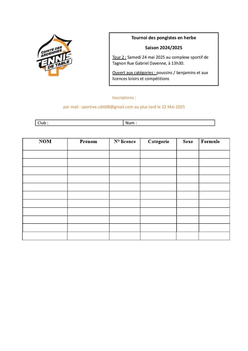 Bonjour à tous, Vous trouverez en pièce jointe, la fiche d'inscription au tournoi des Pongistes en Herbe, qui aura lieu samedi 24 mai à TAGNON. Bonne réception de ces informations