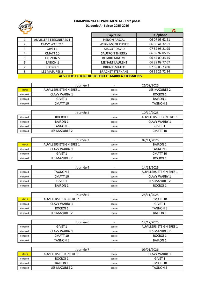 Vous trouverez, en pièce jointe, les poules du championnat phase 1 - saison 2025 / 2026 - Version 2