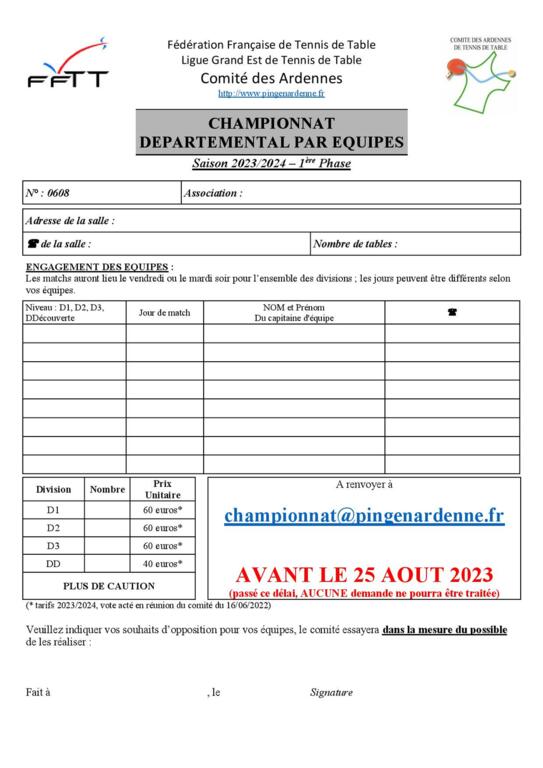 Ci-joint le questionnaire et la fiche d'engagement des équipes pour la 1ére phase du championnat 2023/2024 , la date butoir pour les inscriptions est le 25 aout