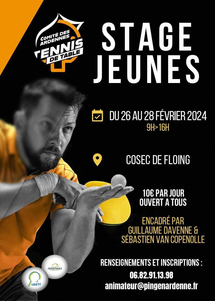 Le Comité des Ardennes de Tennis de Table a le plaisir d'inviter vos jeunes joueurs a participé au prochain stage jeunes organisé du 26 au 28 février au Cosec de Floing