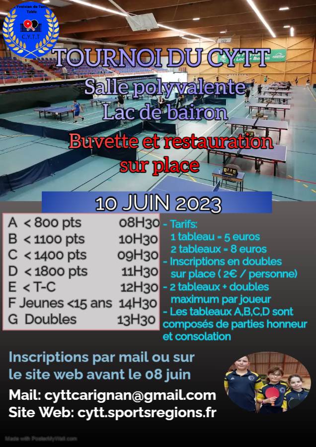 Bonjour à tous, nous avons le plaisir de vous informer que le tournoi de tennis de table de Carignan se déroulera le 10 JUIN 2023 dans la salle polyvalente de Bairon.