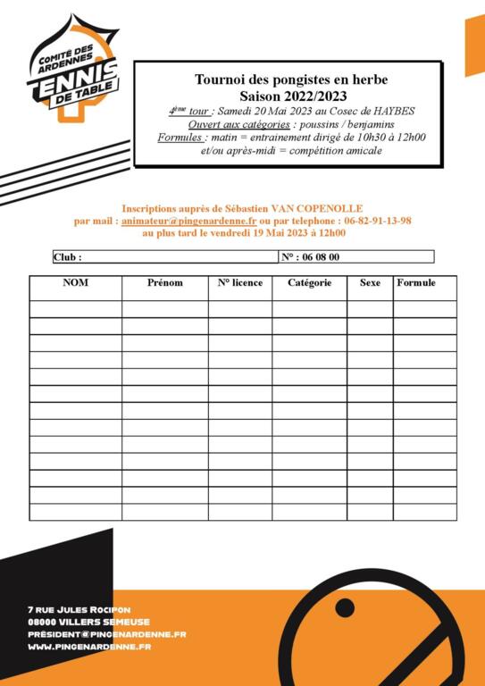 Vous trouverez ci-joint la fiche d'inscriptions pour le 4ème et dernier du tournoi des pongistes en herbe. Celui-ci se déroulera à HAYBES le samedi 20 Mai 2023. Vous en souhaitant bonne réception, Sportivement.