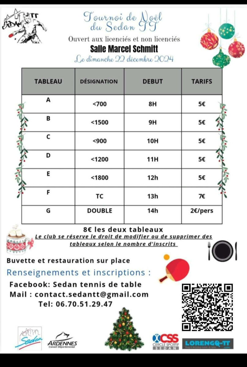 Bonjour, le tournoi amical de Noël du Sedan TT aura lieu le dimanche 22 décembre 2024 à la salle Marcel Schmitt.
